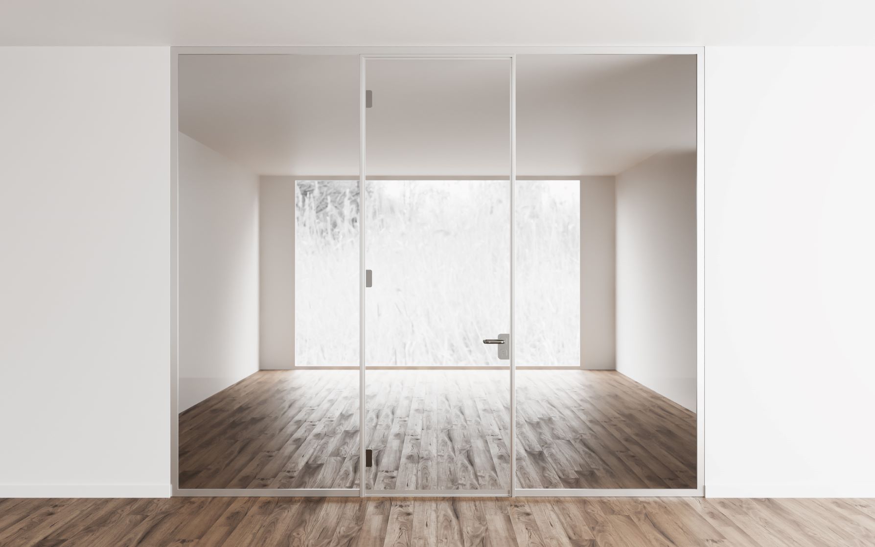 Highly-transparent fully-glazed frameless door with 10-mm single-pane safety glass and an aluminium casing.