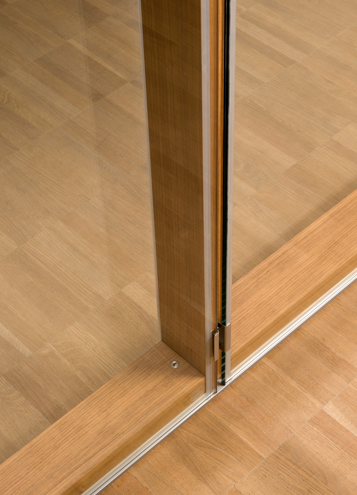 The supporting substructure consists of floor and ceiling-mounted profiles as well as mullions and transoms made from veneered wood products. The glazed elements on both sides are single-pane or laminated safety glass panes that are connected to the wooden mullions with clips. The wall thickness is 100 mm. The system can incorporate a variety of door types (solid, aluminium frame, fully glazed, flush-bonded glazing).