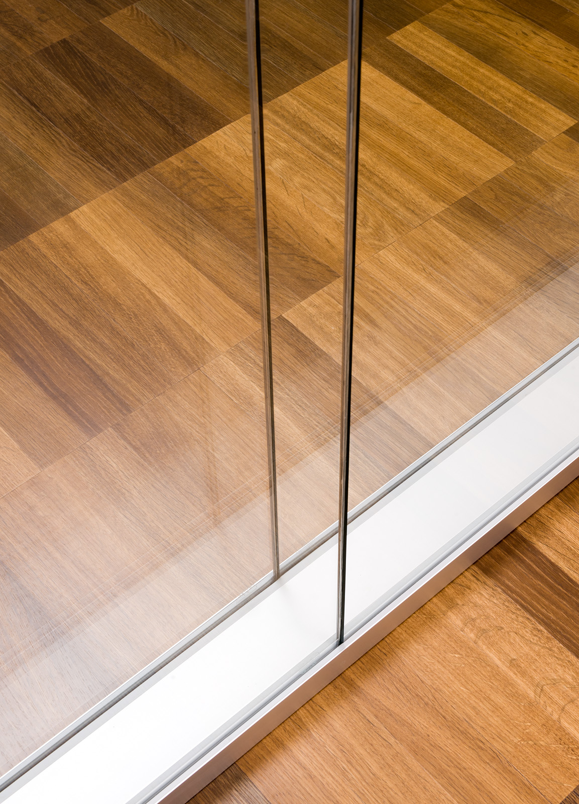 The construction consists of floor and ceiling-mounted profiles that support glazing elements (single-pane or laminated safety glass panes between 10 and 12 mm thick), where the edging uses a special acoustic cruciform joint. The wall thickness is 100 mm. The system can incorporate a variety of door types (solid, aluminium frame, fully glazed, flush-bonded glazing).