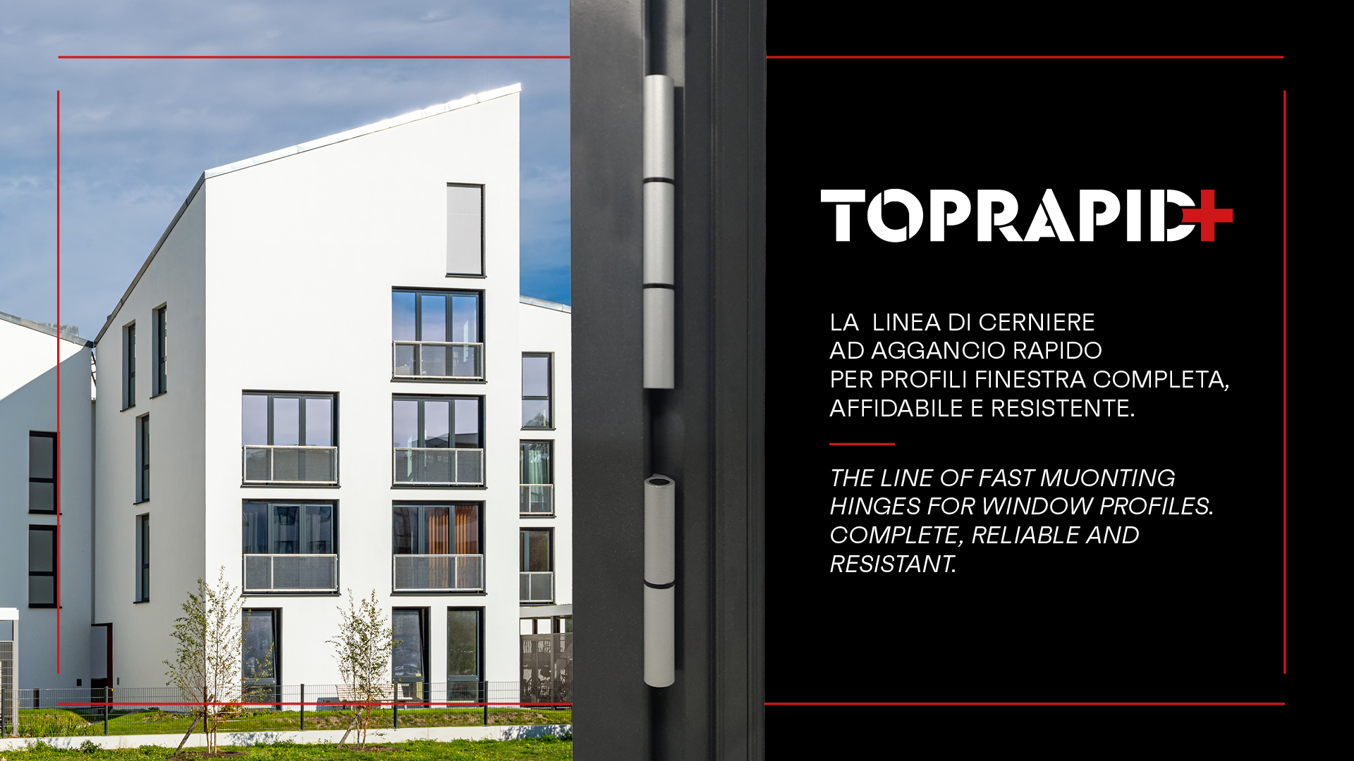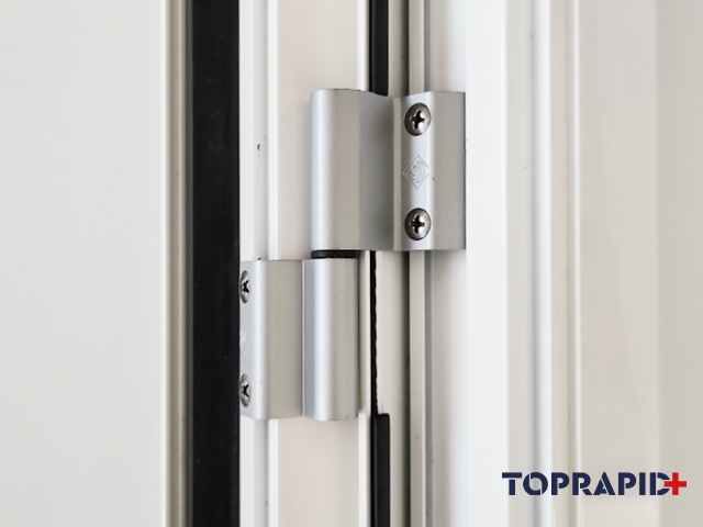 Hinge in extruded aluminum, nylon bushing, stainless steel pin and M5 TSC CR tightening screws. TOP RAPID + Pre-assembled hinge in right-hand and left-hand versions.