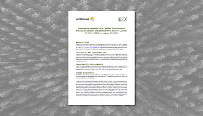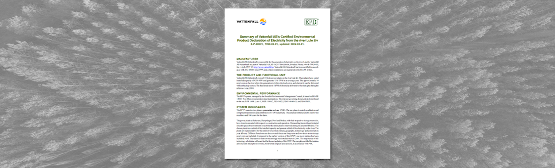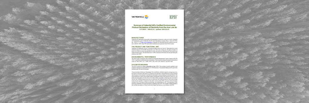 The [FIRST EPD](https://www.datocms-assets.com/37502/1675321973-e_epd1.pdf) certified Vattenfall’s environmental data of electricity production from the river Lule älv. Vattenfall, a European energy/infrastructure company with its headquarter in Sweden, was the first company in the world to certify a product via an EPD. The verifier was SP Sveriges Provings och Forskningsinstitut in Borås, Sweden.