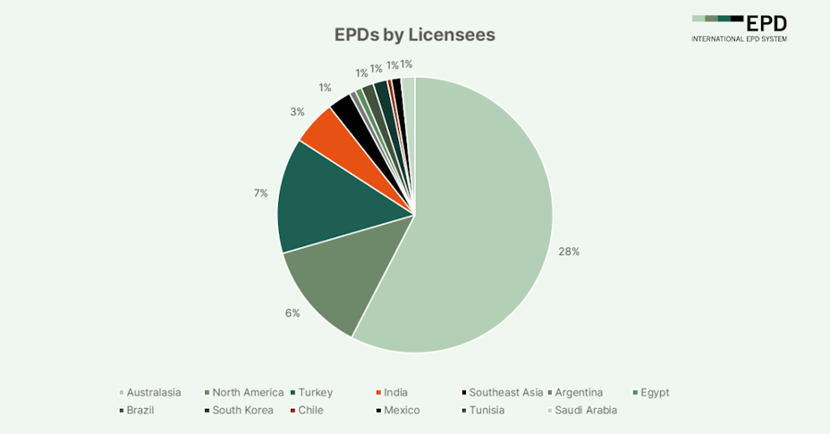 Among licensees, EPD Australasia emerged as the largest contributor, accounting for 2,739 EPDs (29.2%), underscoring the region’s advanced uptake of EPDs. EPD North America followed with 558 EPDs (5.9%), while other notable contributors included EPD Turkey (2.1%), EPD India (1.7%), and EPD Southeast Asia (1.3%). This distribution reflects both the maturity of EPD use in established markets and the increasing engagement of emerging economies.